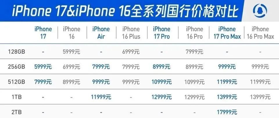 iPhone 17&iPhone 16全系列国行价格对比